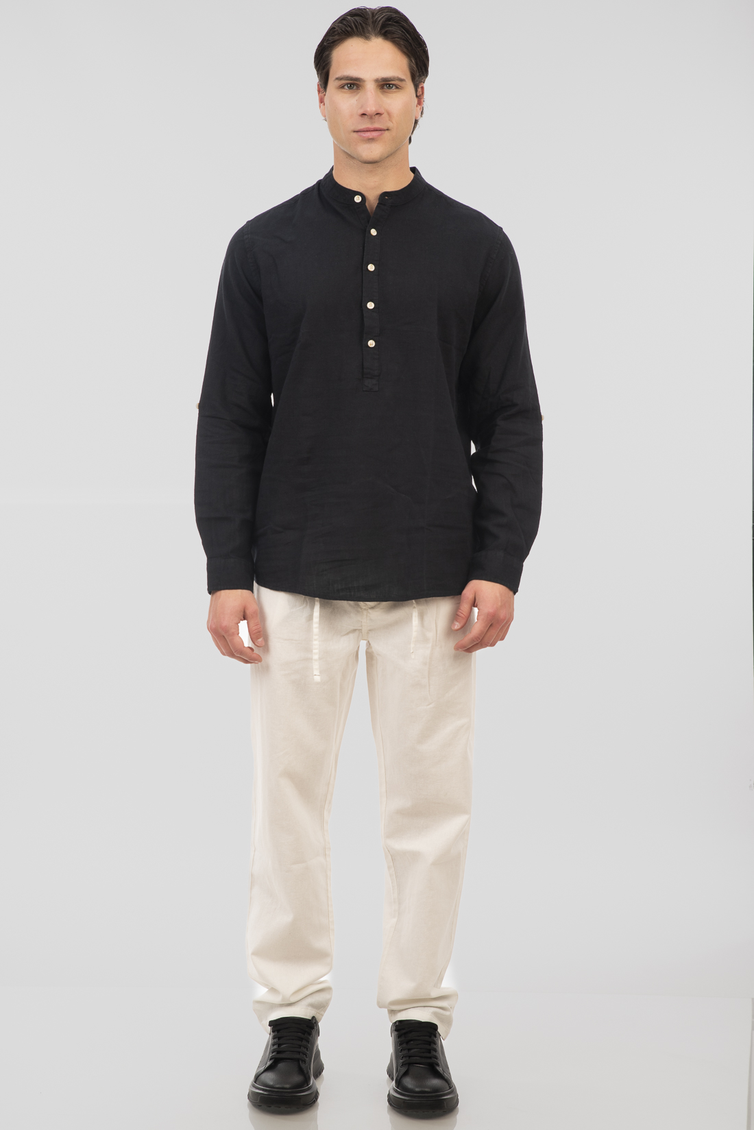Men’s Shirts Linen Blend with Long Sleeves, Mao Collar and Half Button Placket