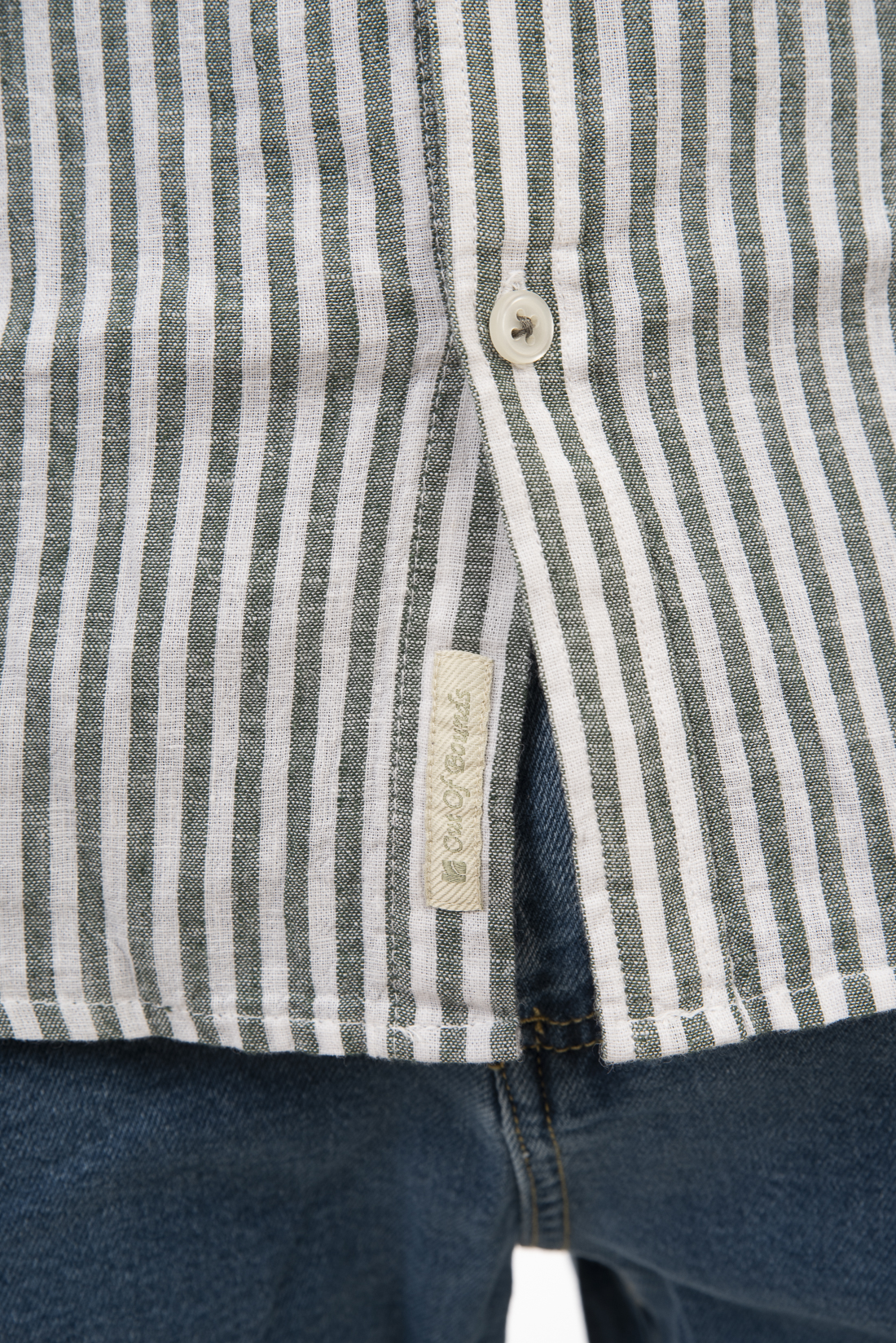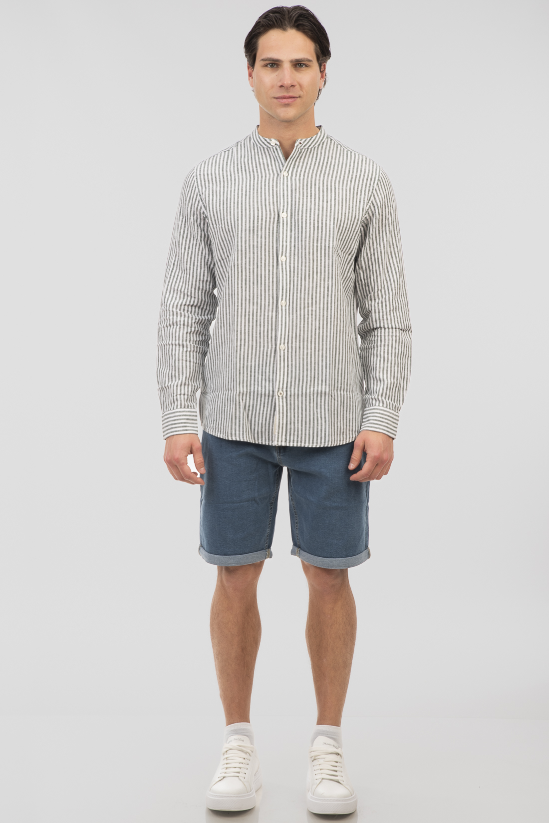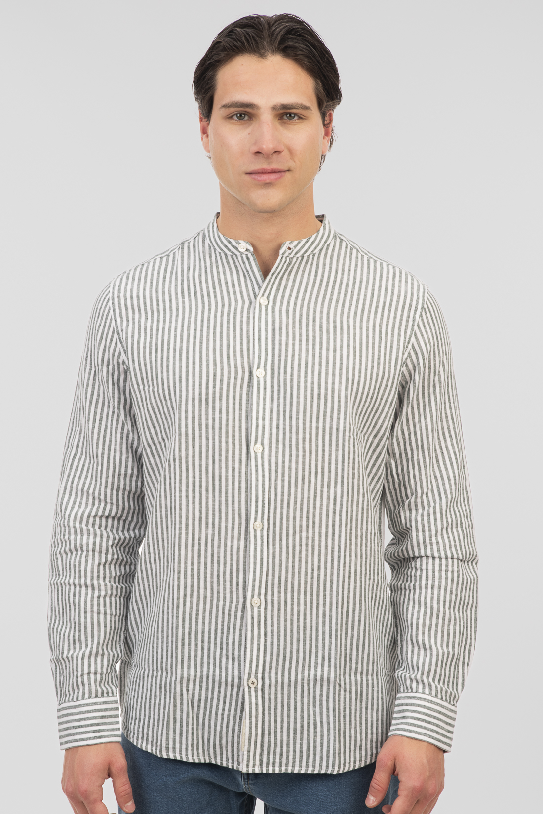 Shirts Linen Blend with Mao Collar and Long Sleeves (Striped) – Olive – Rebase